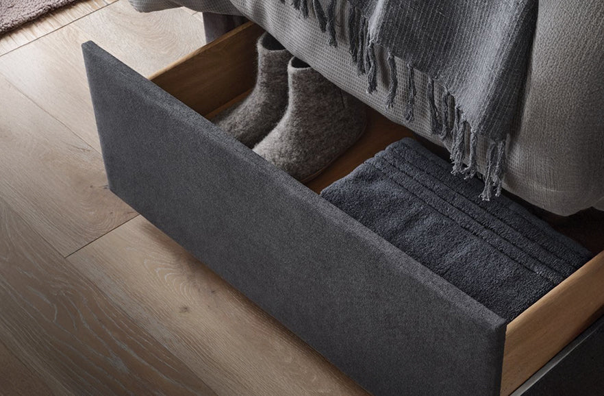 Beneath the mattress lies a strong and supportive divan base constructed from high-quality white wood timber with reinforced corner joints. Available in six standard sizes, the base can be tailored to suit your room and lifestyle. Multiple drawer options are available to help you organize bedding, clothes, or accessories — all while maintaining a sleek, clutter-free look.